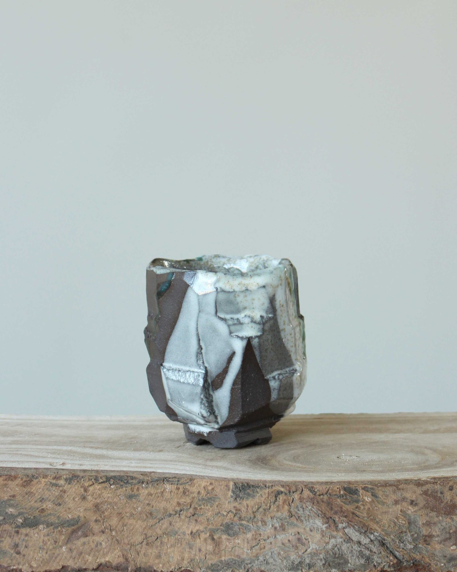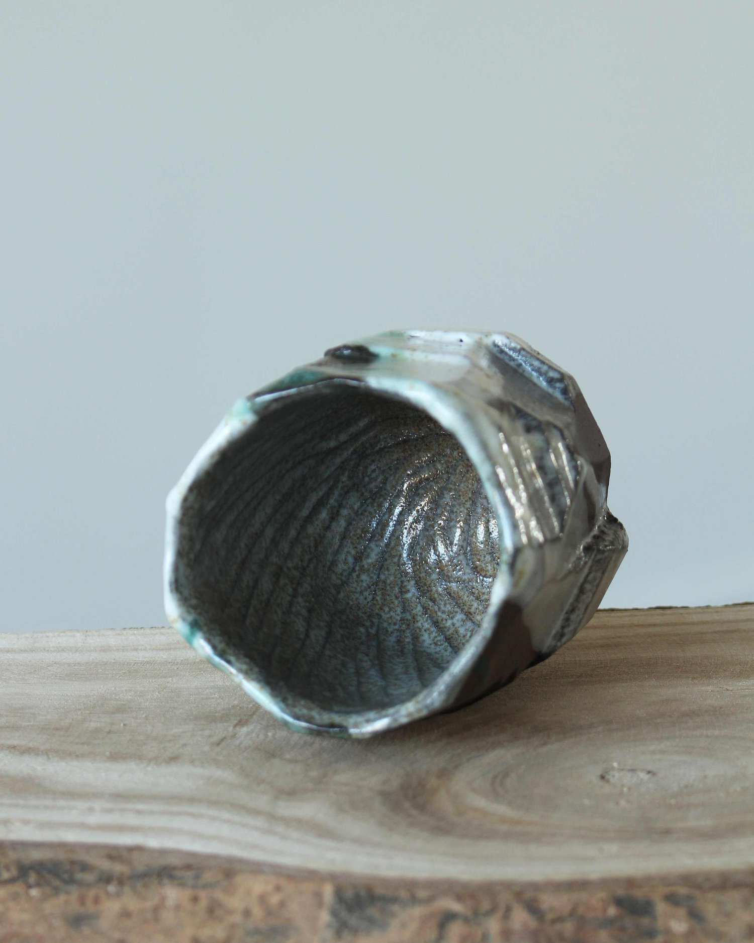 Each item is gradually hand-carved out of a clump of clay adopting to its nature. Gestural pour-patterning of the glaze accentuates the artistic quality of each piece.